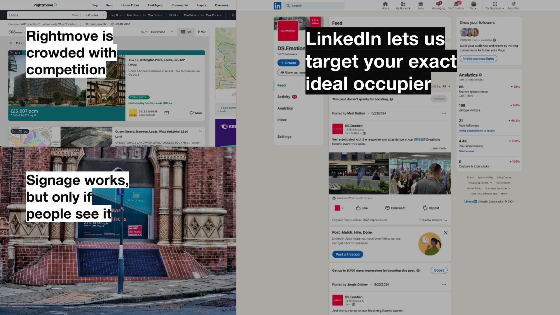 Video and animated campaigns can be more effective at reaching more people with your brand story. Ideal for Brand Story: Video posts can gain more that 200% engagement than static image posts. Video content lets you bring a space to life showcasing spaces, amenity and key features.